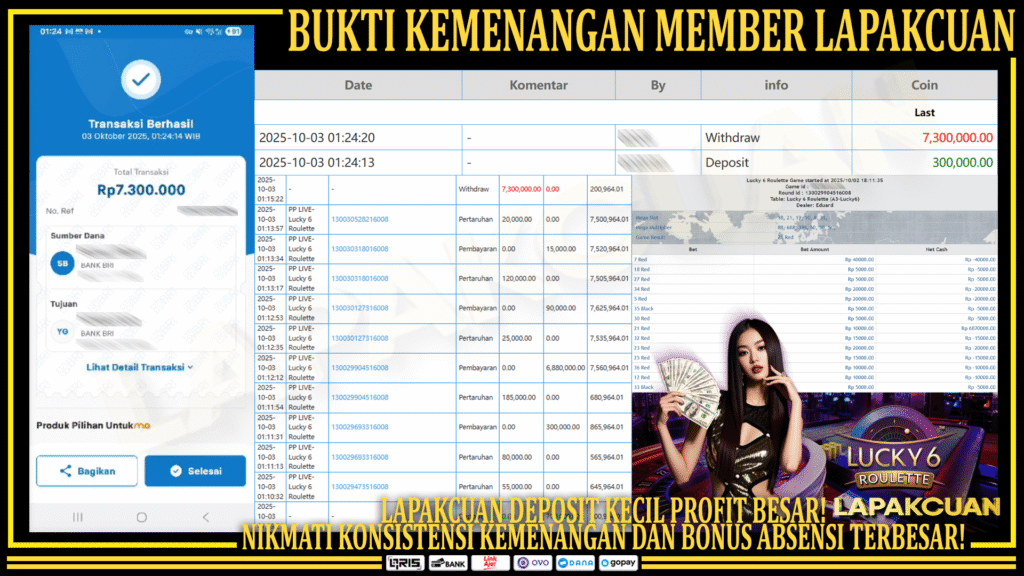 Banyak kisah inspiratif dari para member setia yang awalnya hanya bermain dengan modal kecil, namun akhirnya bisa meraih kemenangan fantastis. Misalnya, ada member yang hanya dengan modal Rp300.000, berhasil meraih kemenangan hingga Rp7.300.000 berkat keberuntungan di Live Game Lucky 6 Roulette Pragmatic Play.